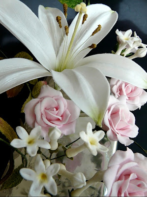 Not only are the flowers fantastic, but check out the lace and ribbon work! (Yes, those are sugar, too.)